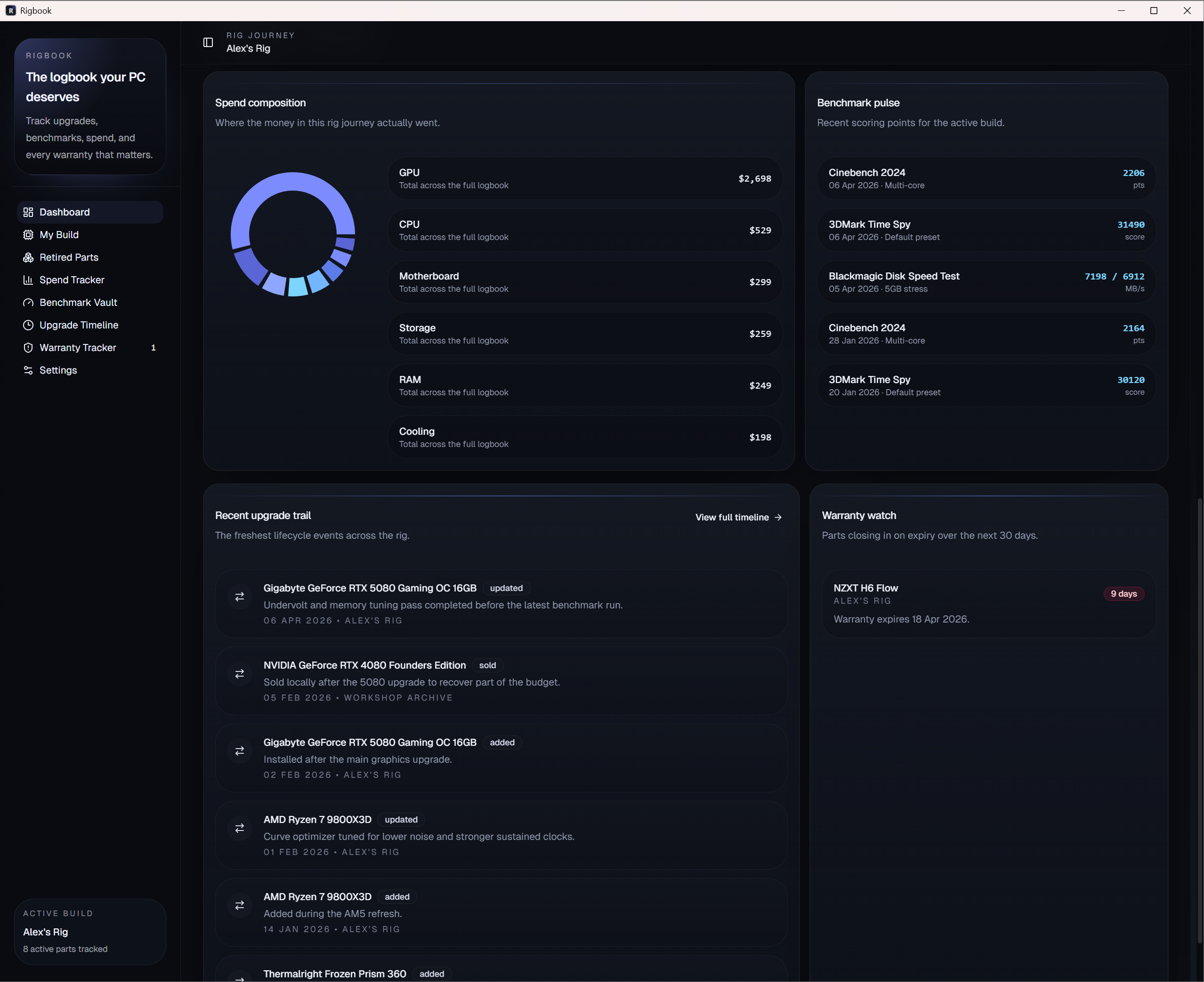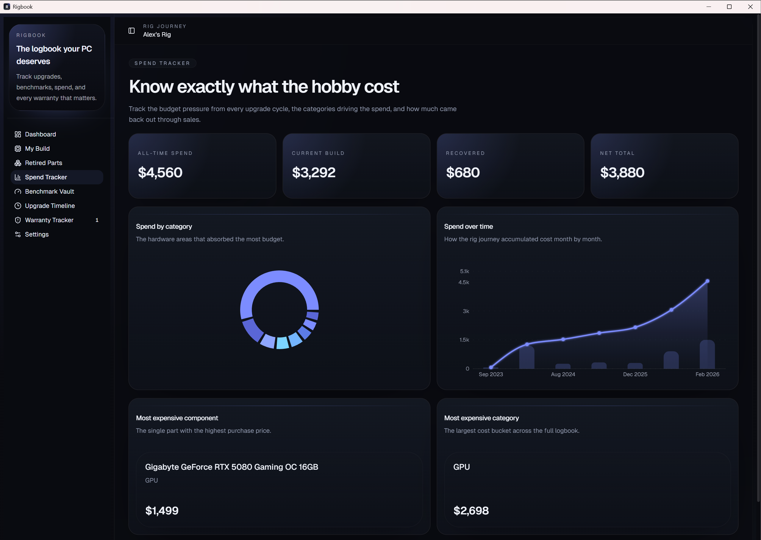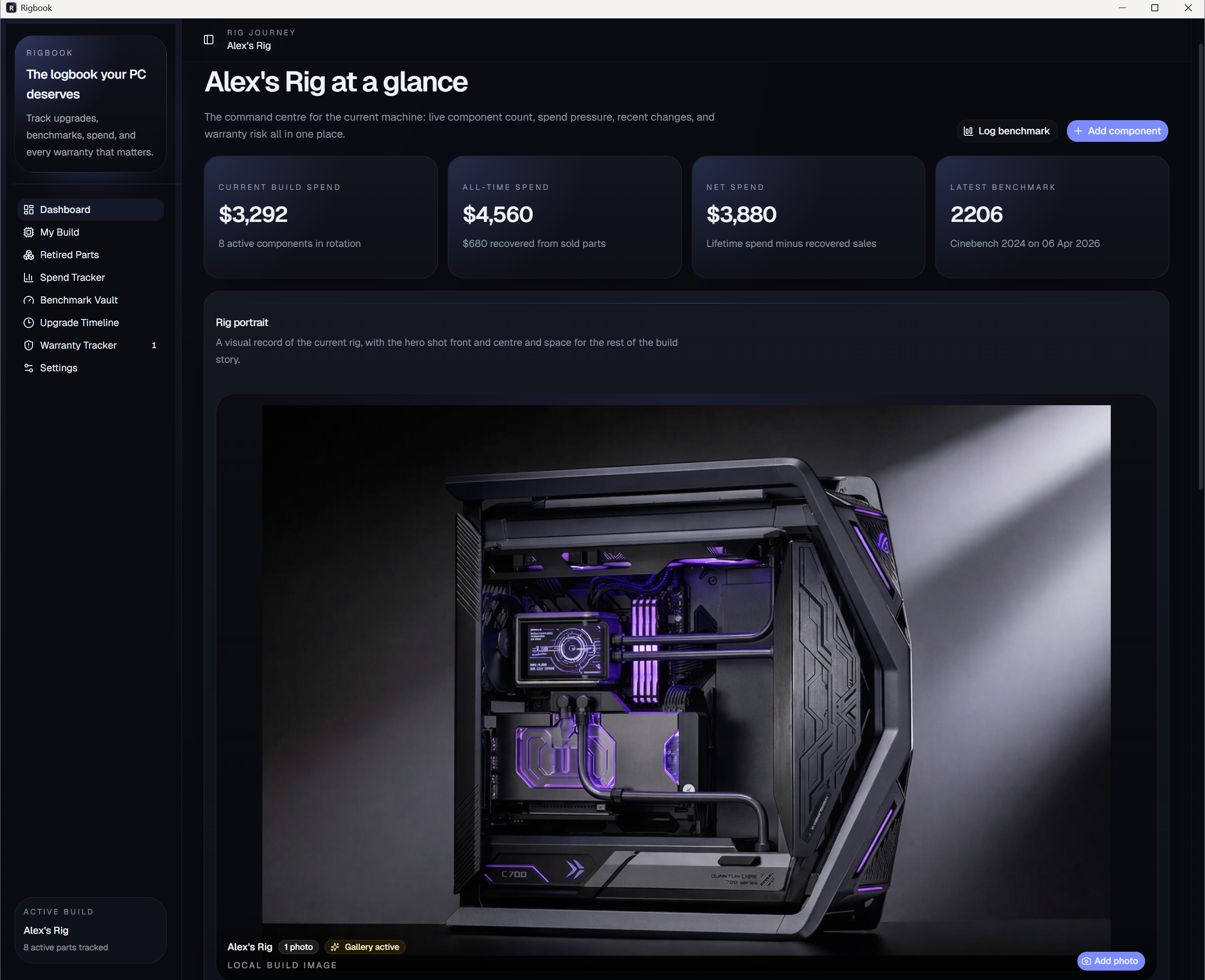 Rigbook is a premium local-first desktop app for PC enthusiasts to track builds, upgrades, benchmarks, warranties, and spend history over time.