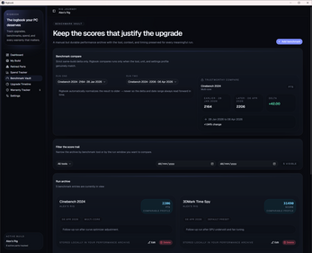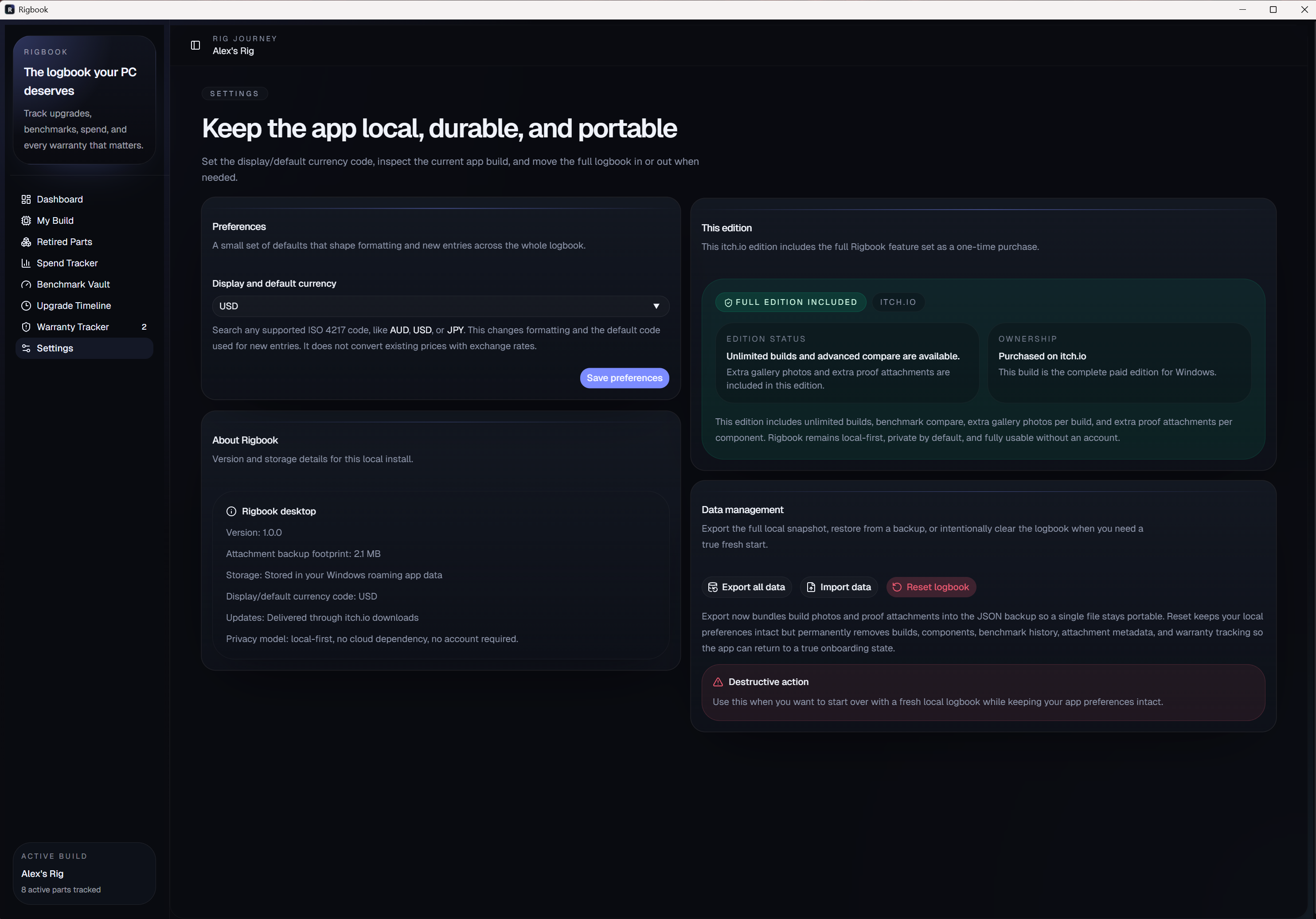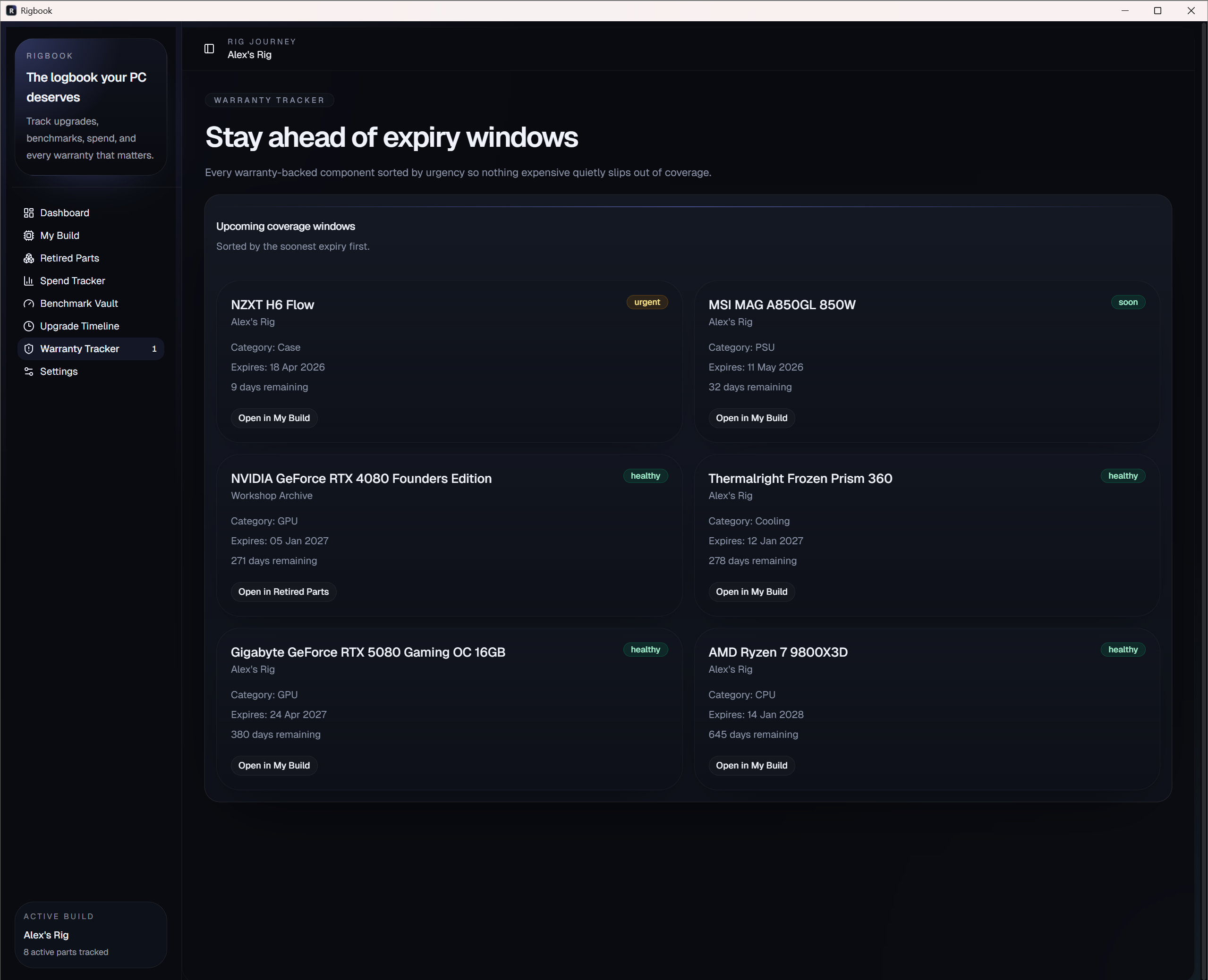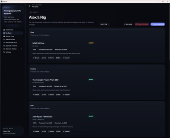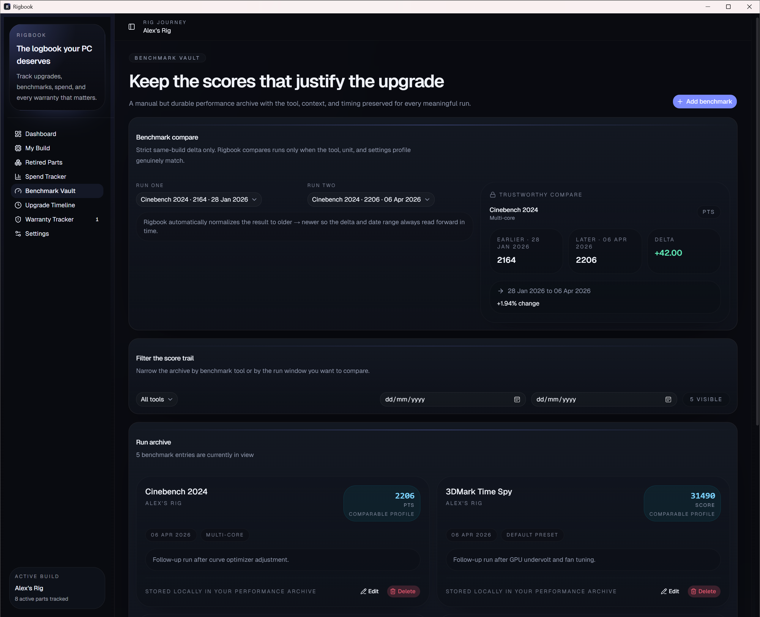 Rigbook is a premium local-first desktop app for PC enthusiasts to track builds, upgrades, benchmarks, warranties, and spend history over time.
